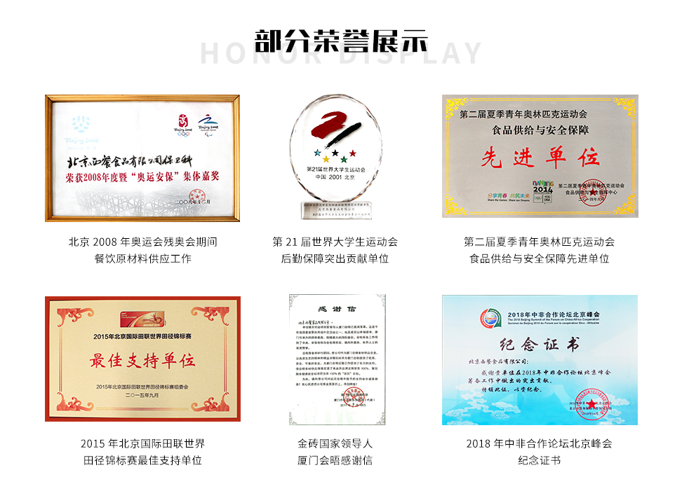 公司先后通過(guò)了HACCP、ISO22000、FSSC22000食品安全管理體系認(rèn)證。是北京奧運(yùn)會(huì)和北京冬奧會(huì)、冬殘奧會(huì)運(yùn)動(dòng)員餐指定的西式肉制品供應(yīng)保障企業(yè),也是第21屆世界大學(xué)生運(yùn)動(dòng)會(huì)、廈門(mén)金磚會(huì)議、上合組織峰會(huì)、中非合作論壇、“一帶一路”、建國(guó)70周年、抗戰(zhàn)勝利80周年、全國(guó)兩會(huì)等多項(xiàng)重大活動(dòng)的肉制品供應(yīng)單位。