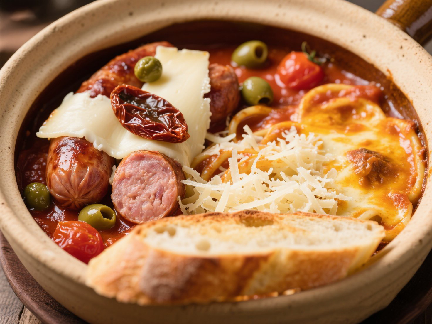 裝盤藝術(shù):深盤墊烤脆面包片 → 舀入燉鍋連汁 → 擦帕瑪森芝士屑