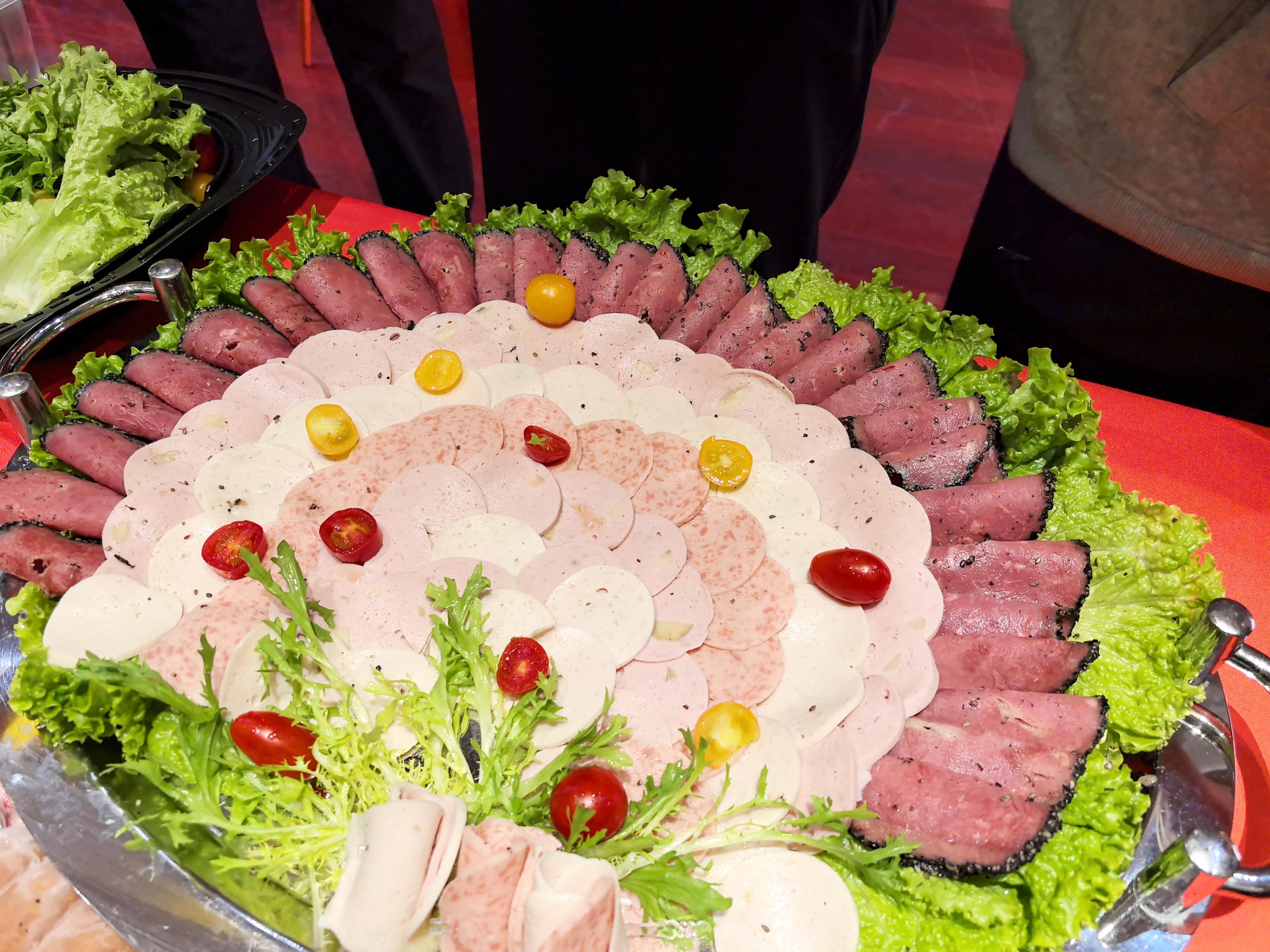 精心準(zhǔn)備的精制培根切片拼盤,肉質(zhì)鮮嫩,咸香適口;德式香腸拼盤更是誠意滿滿,瑞士雞肉烤腸的鮮嫩、圖林根香腸的醇厚、德式香蔥油煎盤腸的鮮香、小牛腸的細(xì)膩,每一款都讓人回味無窮;冷切拼盤里,蘑菇里昂那的獨(dú)特風(fēng)味、黑椒牛肉切片的緊實口感、雞肉冷切腸的 Q 彈,滿足了不同嘉賓的味蕾偏好;還有經(jīng)典的德式脆皮豬肘,外皮酥脆,內(nèi)里肉質(zhì)軟爛多汁,一上桌就吸引了眾人目光,贏得陣陣好評!